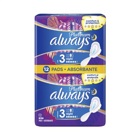 Οι σερβιέτες Always Platinum Ultra Night (Μέγεθος 3) παρέχουν εκπληκτική απαλότητα και αξεπέραστη προστασία σε μία μόνο σερβιέτα (σε σύγκριση με την Always Ultra). Με 1000 μικροσκοπικά μαξιλαράκια στα πλαϊνά και ενισχυμένο πυρήνα, η Always Platinum είναι η Νο 1 σερβιέτα Always για προστασία και άνεση. Επίσης διαθέτει τεχνολογία εξουδετέρωσης οσμών που, όχι απλά καλύπτει, αλλά εξουδετερώνει τις οσμές. Παρόλο που οι σερβιέτες Always Platinum είναι πολύ λεπτές με πάχος μόλις 3 χιλιοστά, προσφέρουν αίσθηση απαλότητας και προστασίας κατά τη διάρκεια της περιόδου σας. Βάζουμε τέλος στους συμβιβασμούς. Με την Always Platinum, έχετε πάντα τον καλύτερο συνδυασμό προστασίας και απαλότητας. Δοκιμάστε την Always Platinum Ultra Night (Μέγεθος 3), την καλύτερη σερβιέτα Always Platinum για προστασία κατά την διάρκεια της νύχτας. Μην πετάτε τις σερβιέτες στη λεκάνη. Διατηρείτε τις σερβιέτες σε δροσερό μέρος